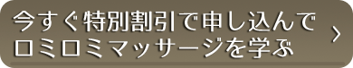 | 受講期間 | 1日間 | 足、ふくらはぎ、もも、手、腕、のロミロミマッサージの手技を学びます。フライトでむくんだ足のむくみを取りながら、技術を学びます。旅の疲れを癒しながら、ロミロミマッサージを身につけよう。 手技数:12手技 |